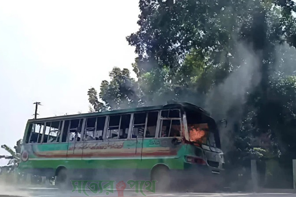 ঘটনার পর ক্ষুব্ধ জনতা ওই বাসে ভাঙচুর ও অগ্নিসংযোগ করে। ছবি: সত্যের পথে[/caption]